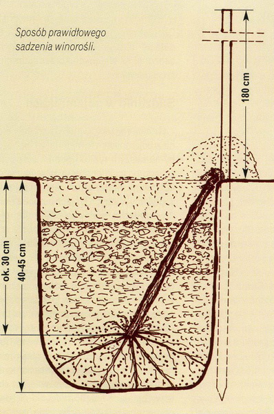 Po wyrównaniu i zabronowaniu pola należy przystąpić do rozmierzenia terenu. Najlepiej rozpocząć od wyznaczenia granic winnicy. Powinna ona mieć kształt prostokąta lub kwadratu. Najpierw wyznacza się dwa przylegające do siebie boki prostokąta, ustalając między nimi kąt prosty. Następnie należy wytyczyć rzędy wewnętrzne i nabić paliki, które powinny znajdować się dokładnie w linii prostej, również w poprzek winnicy. Umożliwia to w pierwszych dwóch latach, gdy nie ma jeszcze rusztowań, uprawę mechaniczną wzdłuż i w poprzek rzędów. Paliki stosuje się z różnych materiałów (drewna, metalu, włókna szklanego). Jeżeli paliki mają w części nadziemnej wysokość minimum 180 cm, to wystarczą na dwa lata uprawy krzewów, a właściwe rusztowanie będzie potrzebne dopiero w trzecim roku. Dołki pod sadzonki o głębokości ok. 40 cm należy wykopać w bezpośredniej bliskości palików od dołu stoku, czyli od strony południowej. Dołki można wykopać szpadlem lub wiercić ręcznym lub motorowym świdrem o średnicy 20-25 cm. Sadzonki na krótko przed sadzeniem zaleca się włożyć po kilkadziesiąt sztuk do wiader z wodą.