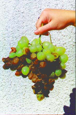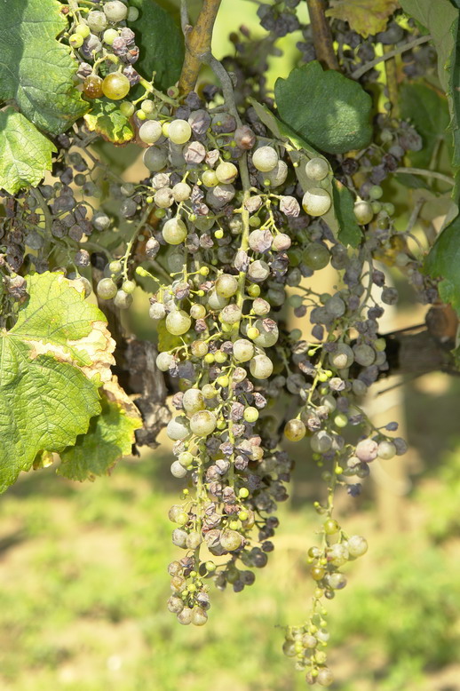 Choroba jest najczęściej spotykana w rejonach, w których występuje grad. Grzyb najczęściej poraża jagody, które w efekcie przyjmują jasnobrązowy kolor, marszczą się i zasychają. Porażone latorośle pokrywają się małymi, brązowymi plamkami. Z upływem czasu plamki rozszerzają się na całą powierzchnię latorośli. Zasychające pędy pokrywają się brązowym nalotem owocników grzyba. Grzyb rozwija się najszybciej na jagodach uszkodzonych mechanicznie, np. gradobiciem, podczas wilgotnej i ciepłej pogody przy temperaturze 25-30°C.Ochrona prowadzona sposobami naturalnymi polega przede wszystkim na niedopuszczaniu do uszkodzeń mechanicznych skórki poprzez zabezpieczanie upraw przed gradem, ptakami, osami. Wszystkie porażone organy krzewu należy wyciąć do zdrowego miejsca i spalić. Przy okazji zabiegów prowadzonych przeciwko mączniakowi rzekomemu środkami zawierającymi mankozeb chroni się częściowo krzewy przed białą zgnilizną. Preparaty miedziowe są nieskuteczne.