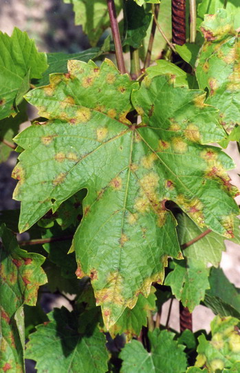 Jest to choroba winorośli rozprzestrzeniona na całym świecie. Grzyb poraża nie tylko większość odmian winorośli właściwej (Vitis vinifera), ale także mieszańce. Objawy występują wyłącznie na liściach. Kilka dni po infekcji na powierzchni blaszek liściowych pojawiają się żółtozielone plamy, a nerwy liści w obrębie plam brązowieją. Po pewnym czasie plamy zlewają się, ciemnieją i zasychają. Na liściach odmian o owocach jasnych plamy zabarwiają się na żółtobrązowo, a o owocach granatowych - na czerwono. Ostatecznie plamy na liściach odmian o owocach jasnych stają się brązowe, z delikatną, żółtą obwódką, a w przypadku odmian granatowych, są czerwonobrązowe z czerwoną obwódką. Występowanie obwódki jest charakterystycznym objawem tej choroby. Szkodliwość choroby polega głównie na zmniejszeniu powierzchni asymilacyjnej, w wyniku czego owoce później dojrzewają. Gorzej drewnieją również latorośle, a krzewy gromadząc mniej substancji zapasowych, w zimie łatwo przemarzają.Nasilone występowanie choroby obserwuje się najczęściej po suchych zimach z małą ilością śniegu i następujących po nich okresach deszczowej pogody w maju i czerwcu.